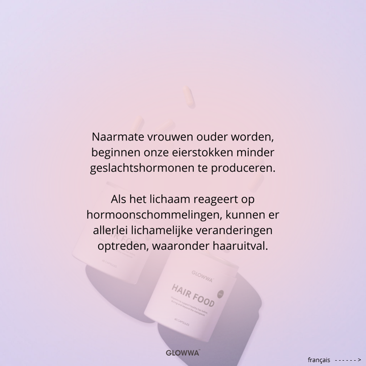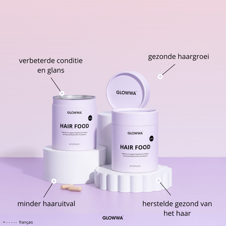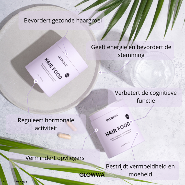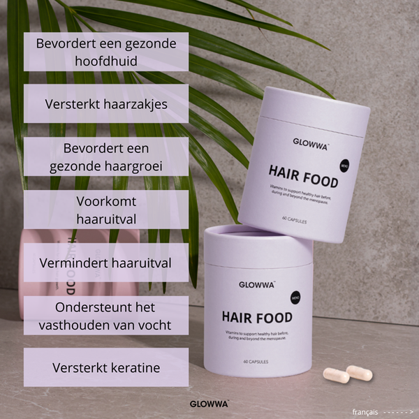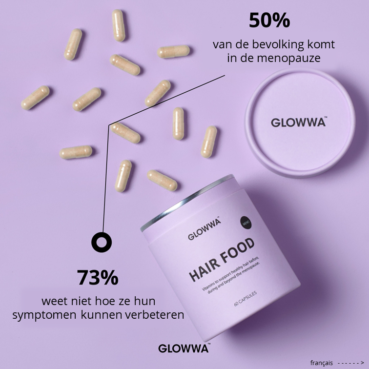 Voel je je haar dunner, droger of minder levendig worden door de menopauze? Glowwa Hair Food Meno is speciaal ontwikkeld om vrouwen in deze levensfase te helpen hun haar gezond, sterk en glanzend te houden. Dit unieke haarvoedingssupplement, verkrijgbaar in een potje met 60 capsules, combineert natuurlijke krachtpatsers zoals biotine, collageen, vitamine C, zink en specifieke plantenextracten die hormonale schommelingen ondersteunen.
